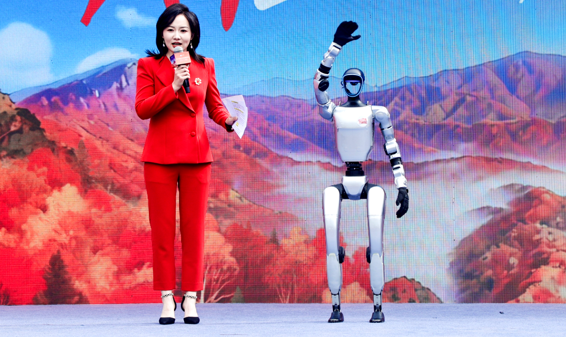 开幕式上,由机器人担当部分环节的主持任务。机器人独舞表演查尔斯顿舞《光雾红》灵动活泼,赢得了现场观众的阵阵掌声。最为瞩目的,当数“人机共创”国家级非遗《翻山铰子》,舞蹈演员与多台机器人同台演绎,传统艺术与现代科技完美交融,生动诠释了文旅融合的创新活力。